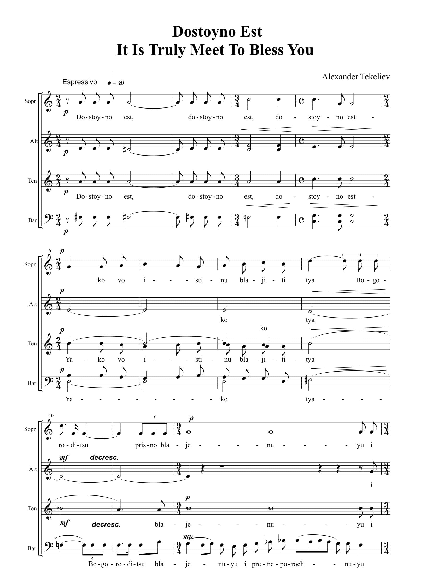 Tekeliev’s setting of this devotional hymn to the Virgin Mary from the Orthodox Divine Liturgy is written in a conservative style and is intended for a church choir of modest means. The setting exhibits a homophonic texture with careful textual underlay.