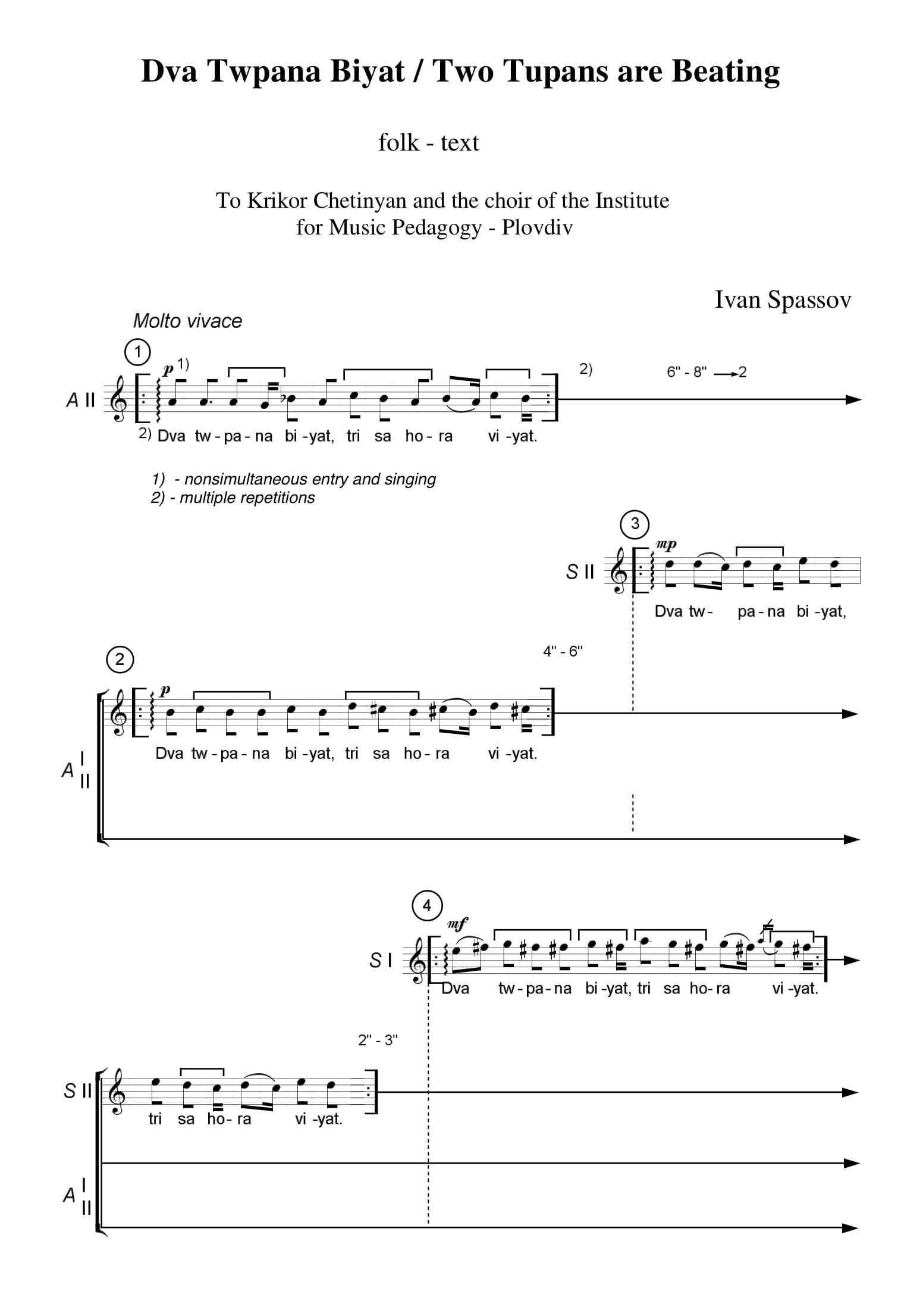 Vox Bulgarica Music Publishers is proud to be the publisher and distributor of the music of Ivan Spassov. Until his untimely death in December 1996, Spassov was the leading composer of his generation and the undisputed master of the choral idiom. Spassov used the well-established Bulgarian folksong as a compositional point of departure, combining the style made famous by his predecessors with aleatoric devices and graphic notation. The result was a new style that combines the folk with the avant-garde and something that is distinctly Bulgarian. In this prize-winning number and choral favorite, Spassov employs vocal techniques to recreate the sound of the traditional folk drum, the Tupan.