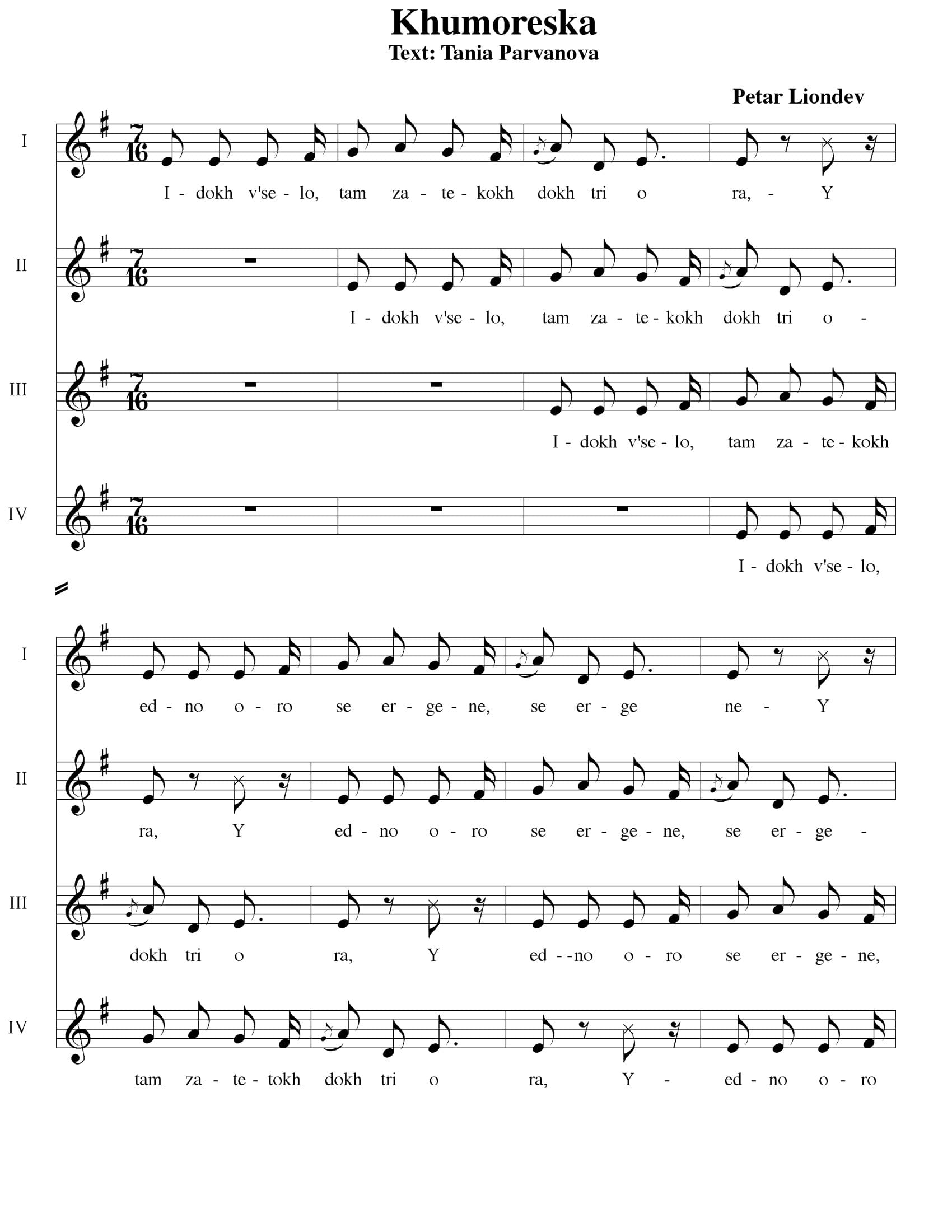 For 4 Acapella female voices. Text by Tania Parvanova. Transliterated Bulgarian.