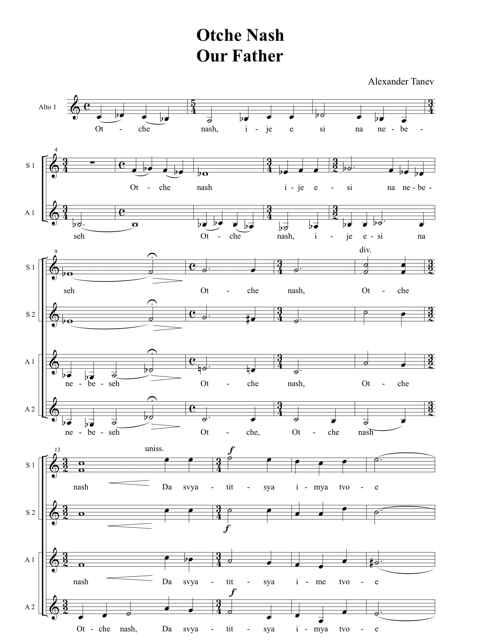 Tanev’s rendering of the Lord’s Prayer is intended for a church use with modest forces. In it the composer opts for a simple homophonic setting with mild chromaticism with careful textual underlay, shifting the time signatures to support the correct textual accentuation. The composer employs mild chromaticism for word painting.